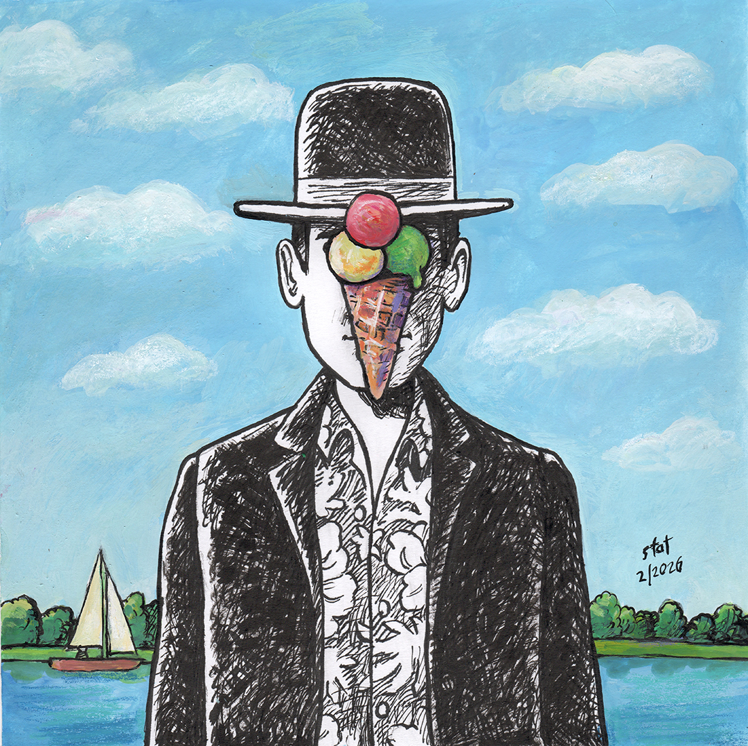 ![]() Das Eis des Mannes (frei nach Magritte) Tusche und Gouache auf Papier · 20 x 20 cm |