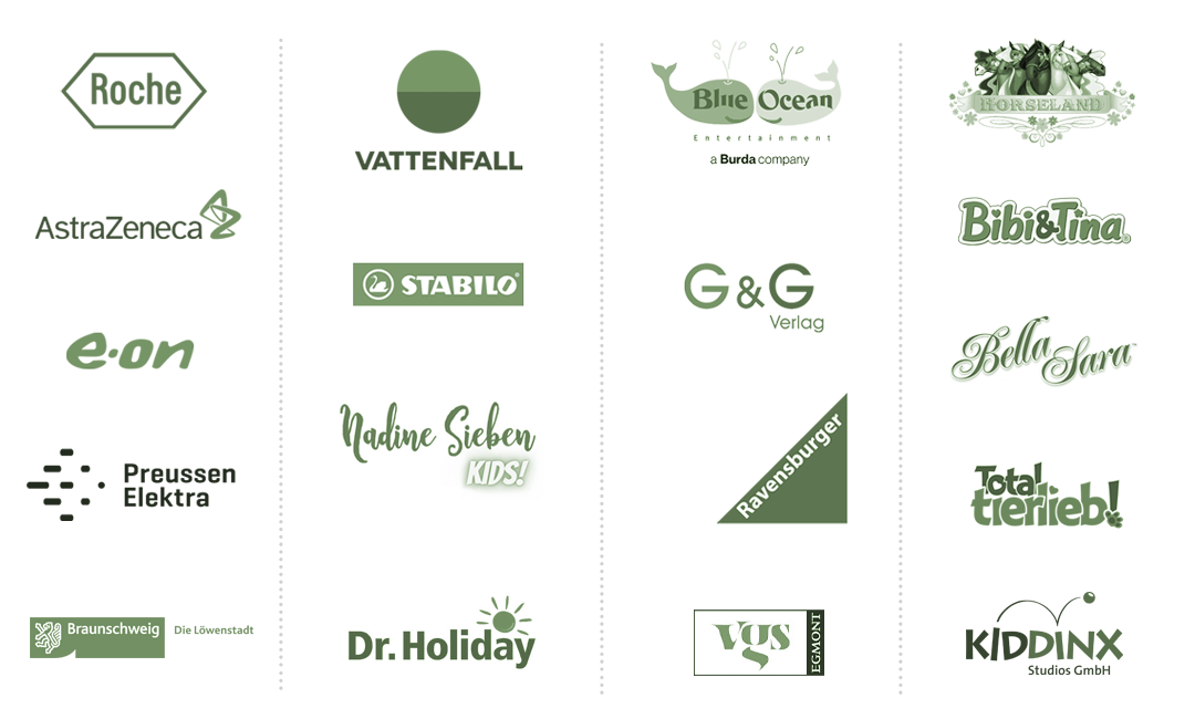 Medizin & Gesundheit Roche Pharma AG AstraZeneca GmbH Dr. Holiday AG Konsumgüter, Industrie und Finanzen E.ON Vattenfall Wärme Berlin AG Endress+Hauser, Maulburg PreussenElektra GmbH Stabilo International /Stabilo UK American Express Versicherungen div. Stadt & Bildung Stadt Braunschweig Cosmos Media UG (Helles-Koepfchen.de) Haus der Brandenburgisch-Preußischen Geschichte (HBPG) Kultur & Entertainment Nadine Sieben Kids! (Karussell/Universal Music) Musikagent JMS GmbH Antenne Bayern Der kleine Nils H&V Entertainment Media Consulta (mc Group) Slow Art Galerie, Nürnberg
