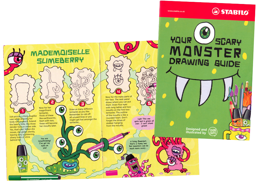 Zeichnen lernen mit Monstern. Konzept, komplettes Artwork, Gestaltung und Texte von TOONCAFE, passend zu der von uns gestalteten Boss Mini Stifte-Edition.